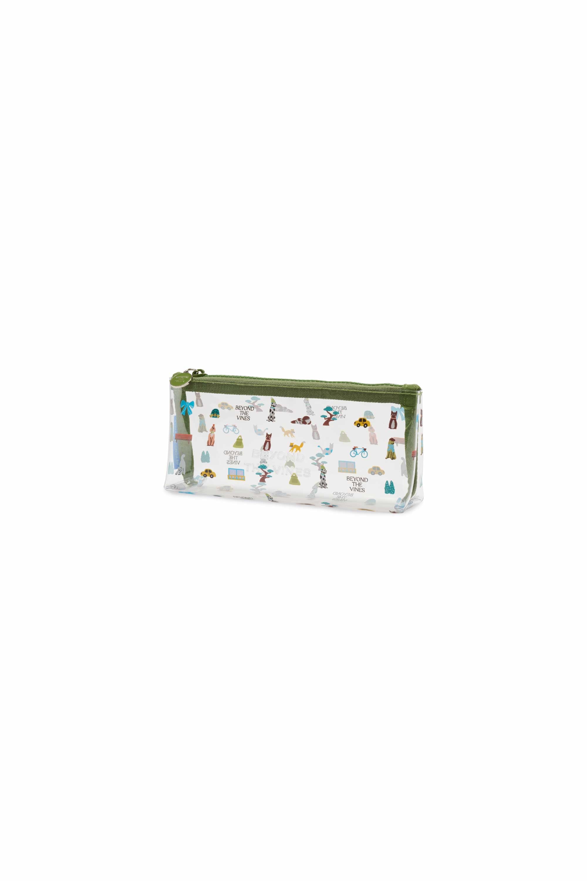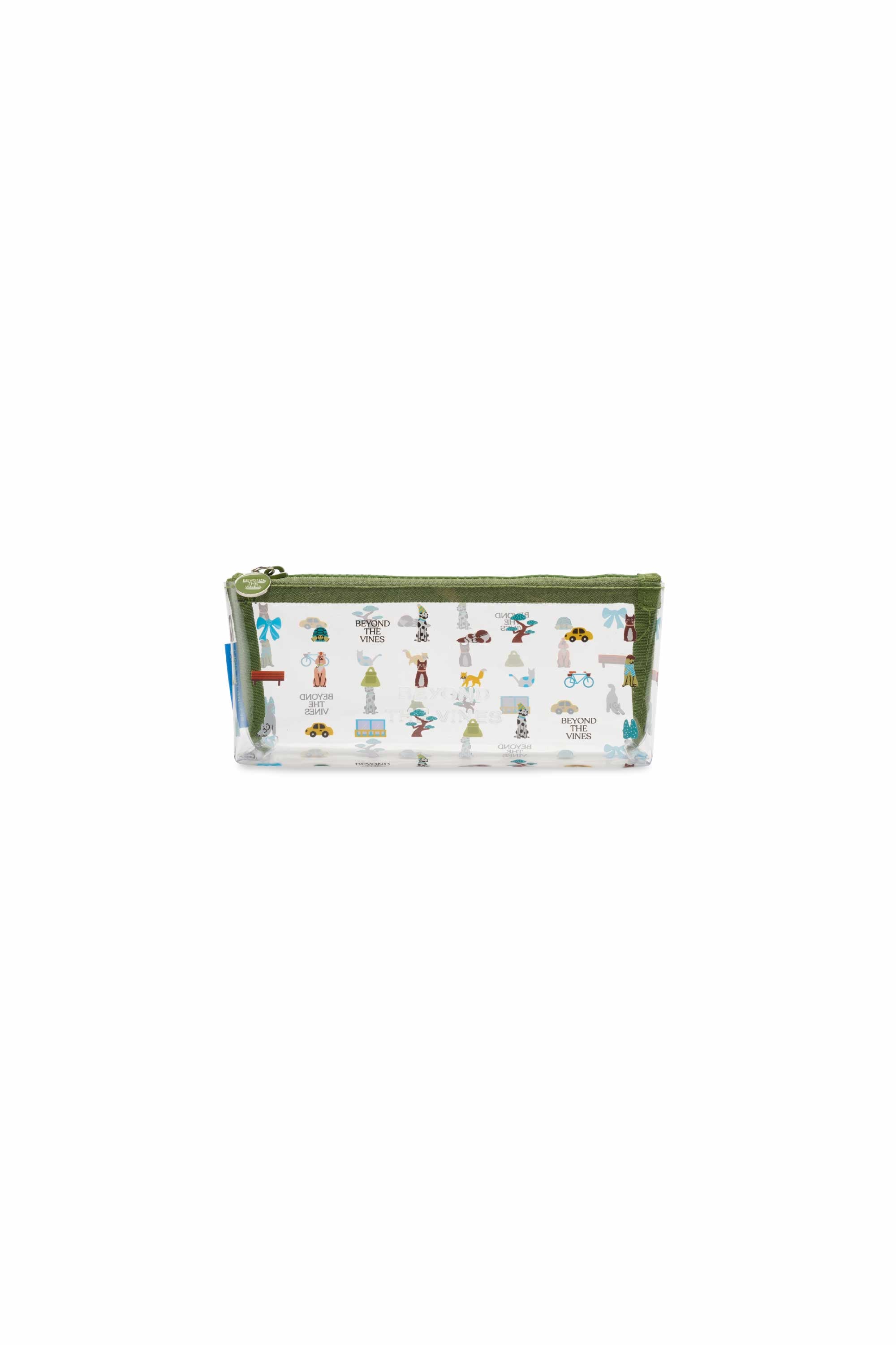 Designed with our Beyond Boulevard graphic and a contrast zipper, this clear PVC pouch has slim rectangular silhouette and is the perfect add on to contain all your small travel items. It is finished with the brand logo embossed on the front.