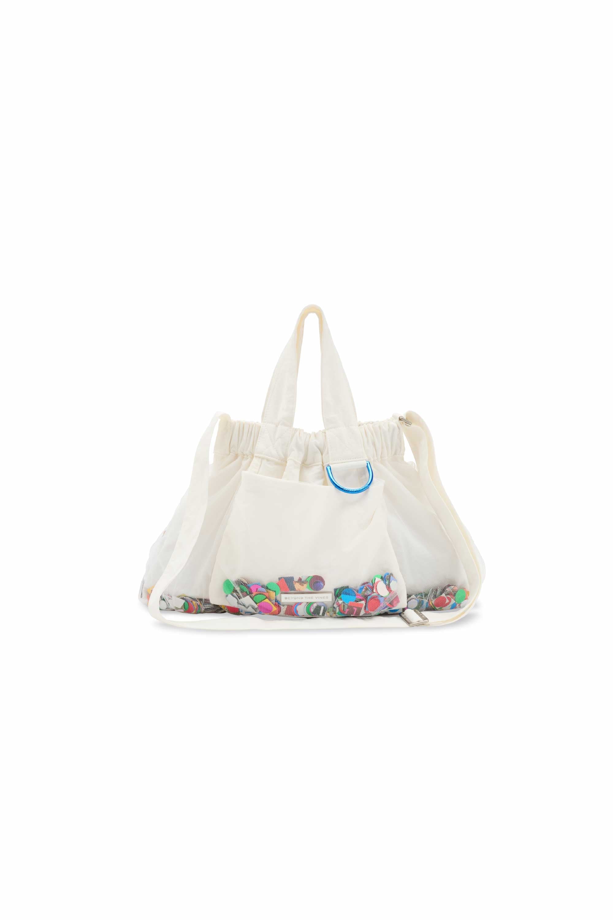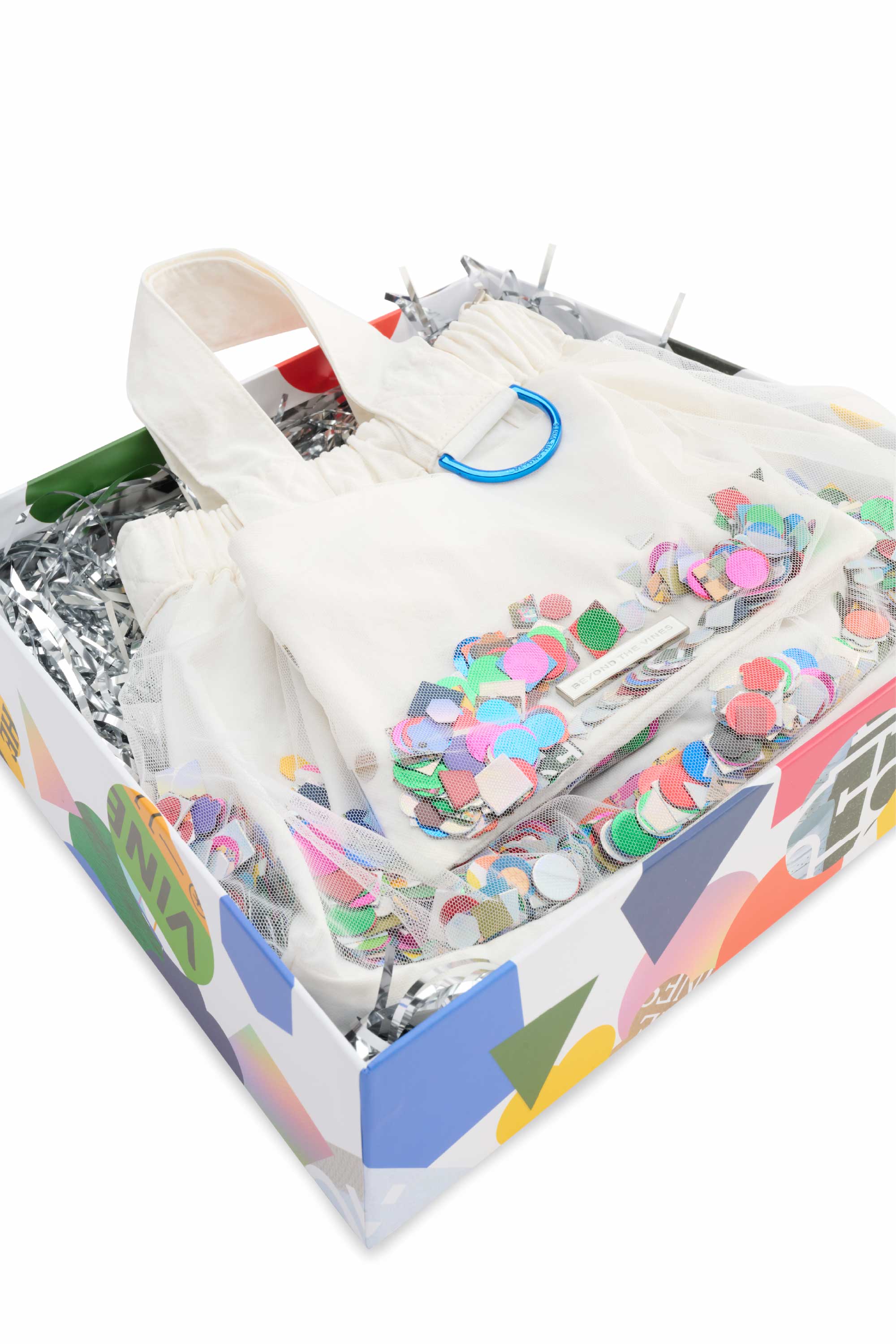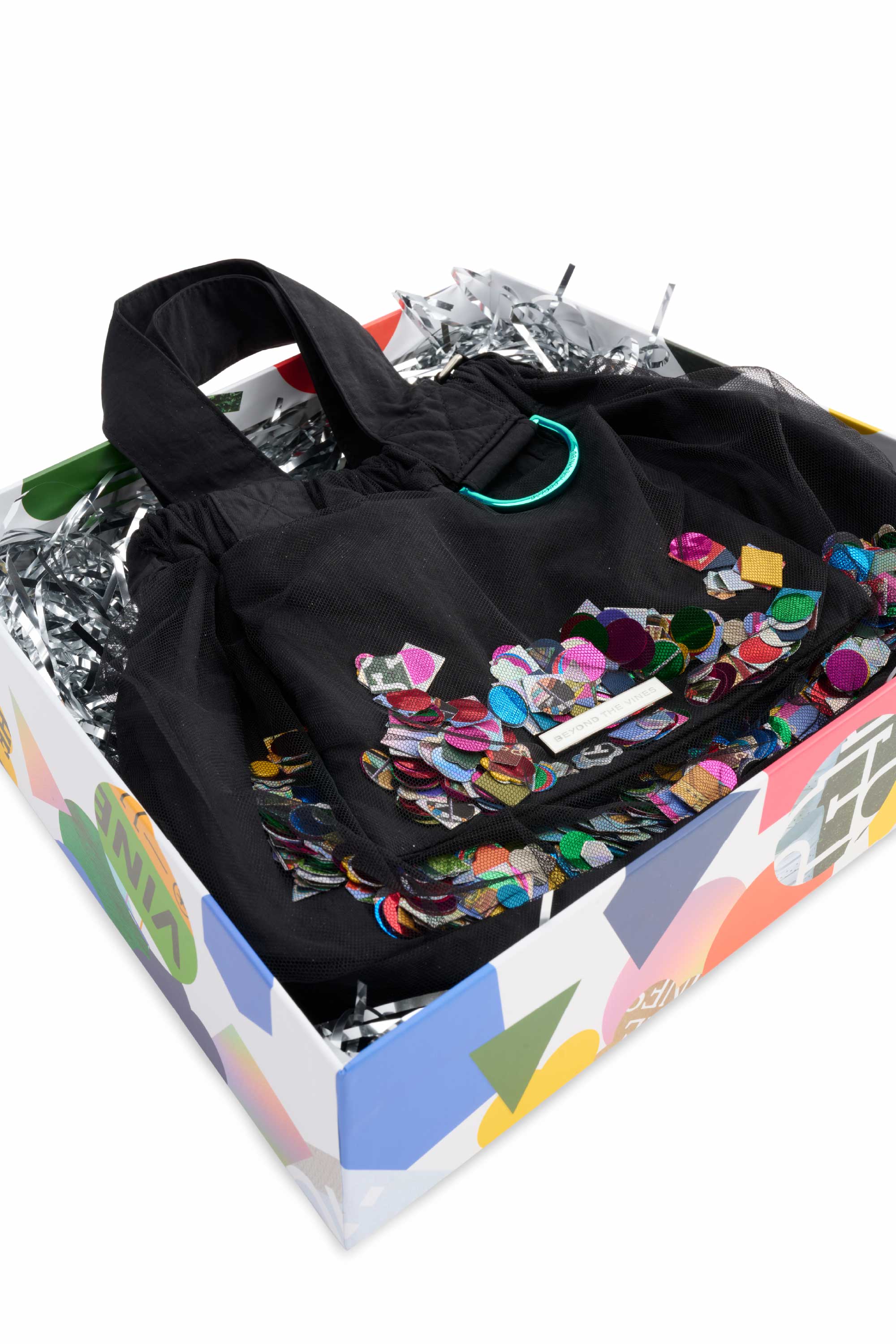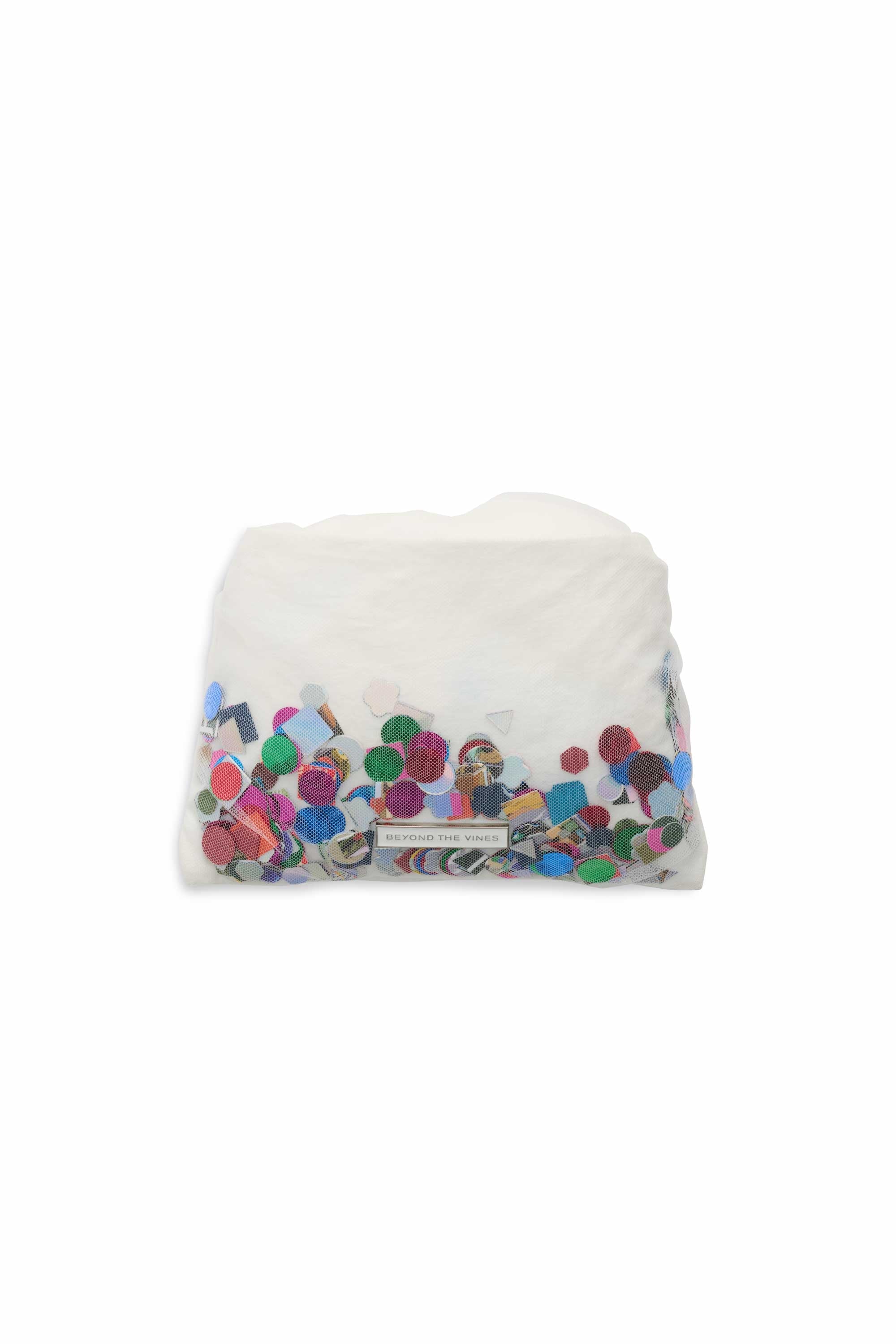 Introducing the Limited Edition Confetti Dumpling Bag, created in celebration of Beyond The Vines’ 10th anniversary. This special design layers soft mesh over durable nylon, with a playful mix of confetti - a blend of curated colours, materials, and archival Beyond The Vines posters, making each bag one of a kind. Finished with a coloured chrome D-ring, a magnetic closure, and an additional inner pocket, this statement piece is both functional and collectible.