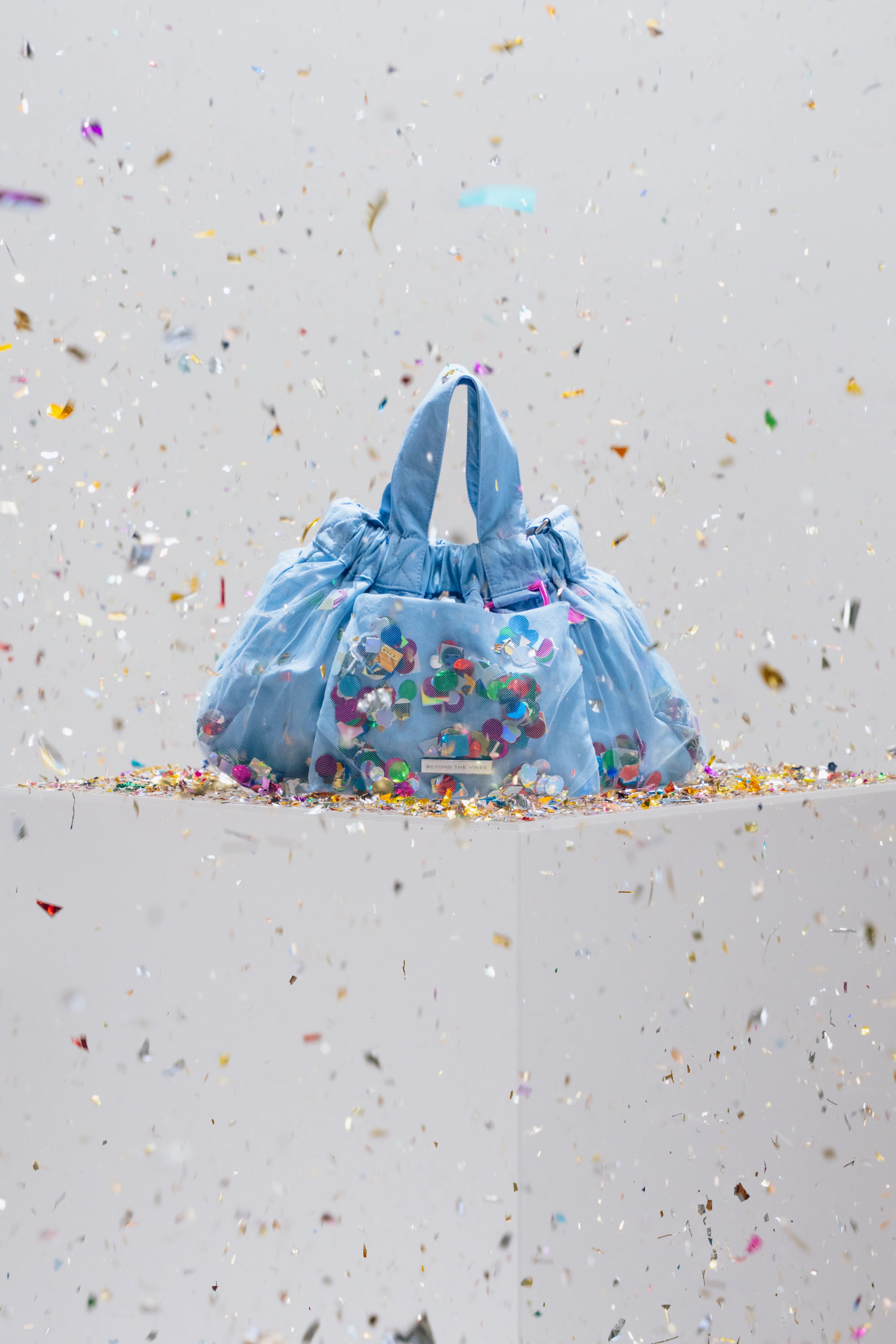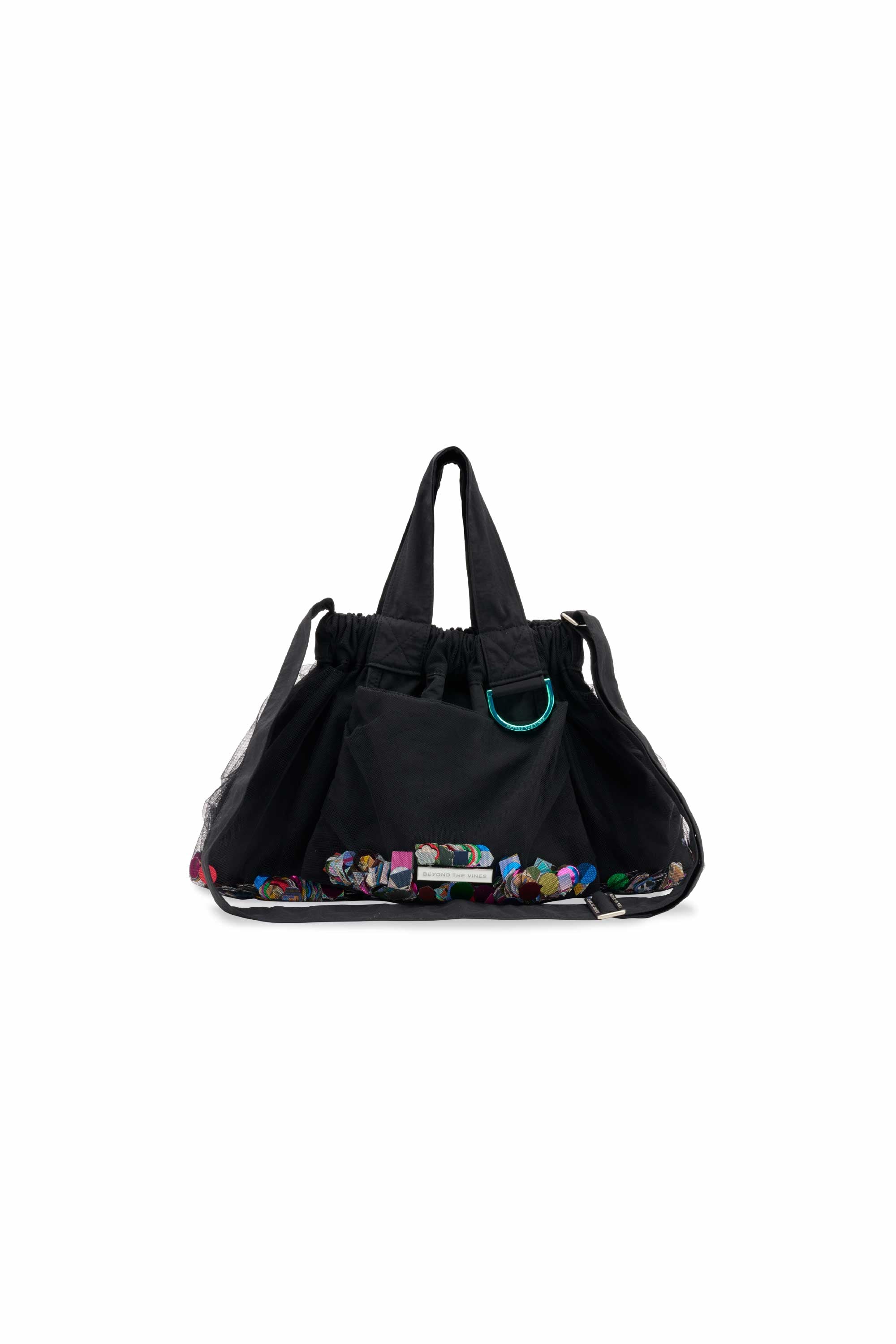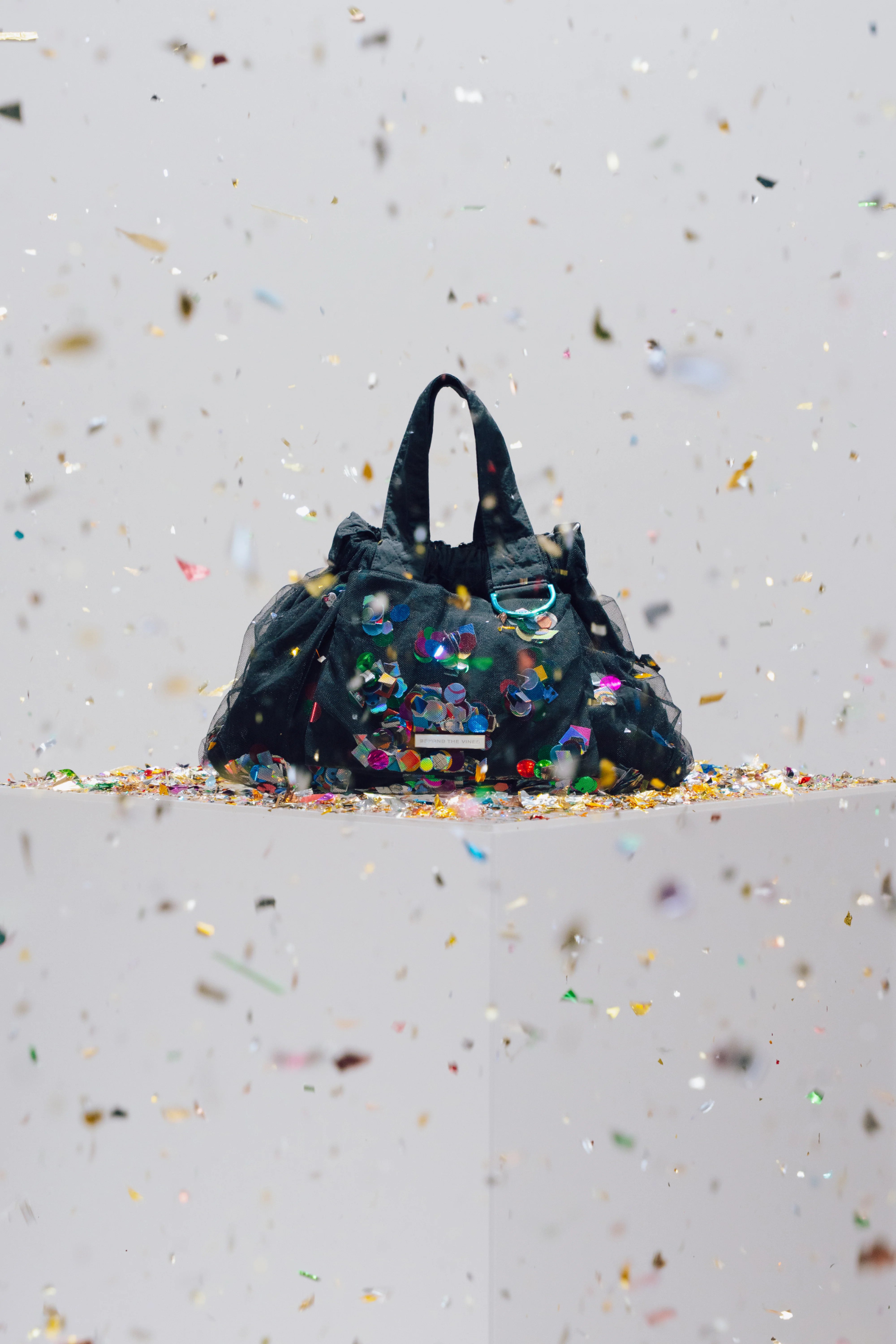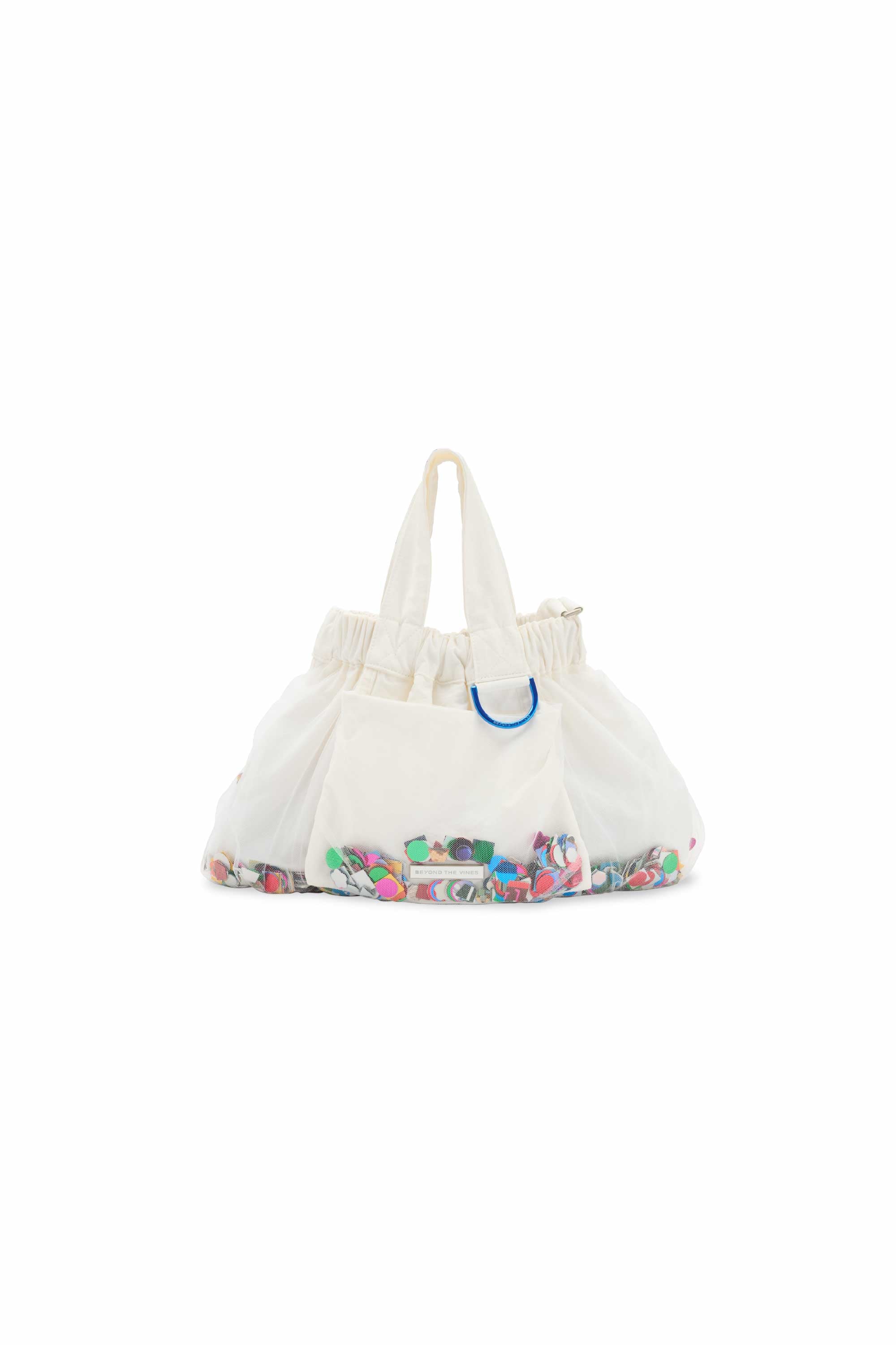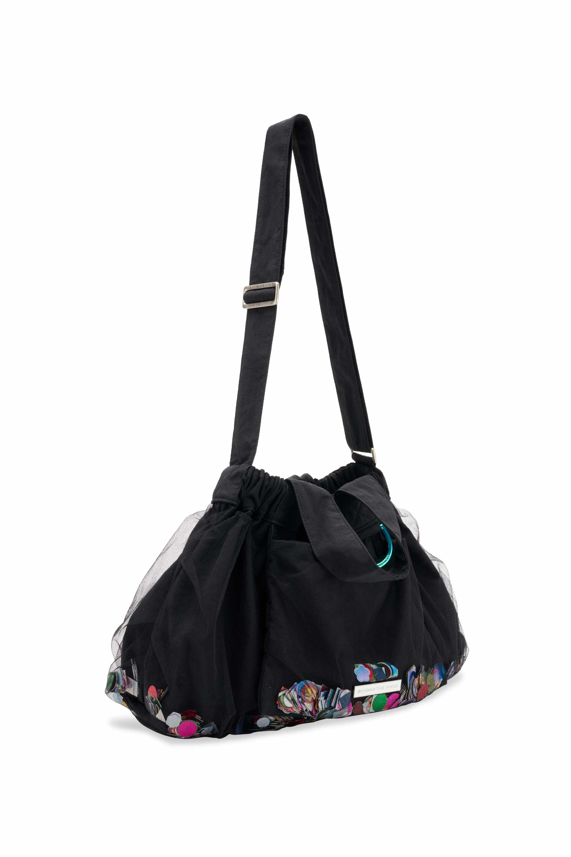 Introducing the Limited Edition Confetti Dumpling Bag, created in celebration of Beyond The Vines’ 10th anniversary. This special design layers soft mesh over durable nylon, with a playful mix of confetti - a blend of curated colours, materials, and archival Beyond The Vines posters, making each bag one of a kind. Finished with a coloured chrome D-ring, a magnetic closure, and an additional inner pocket, this statement piece is both functional and collectible.