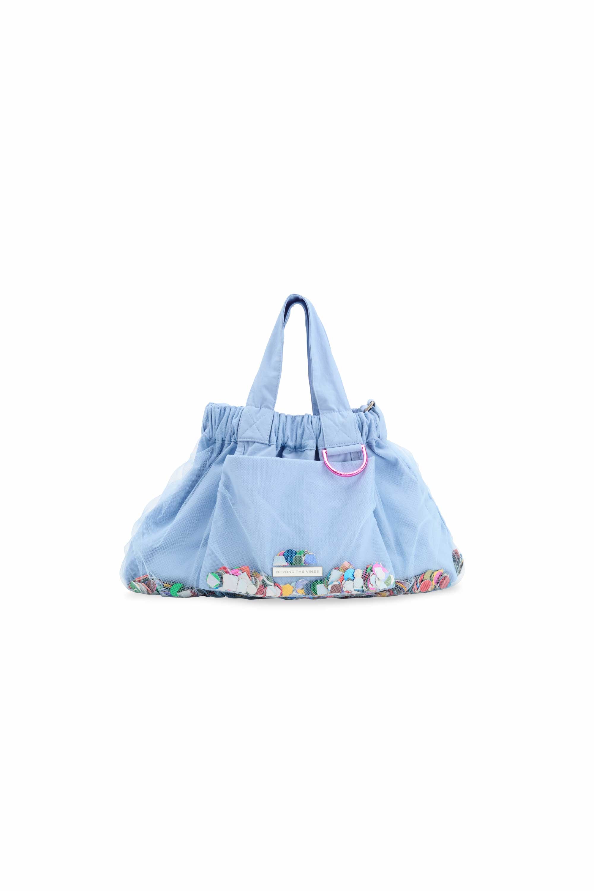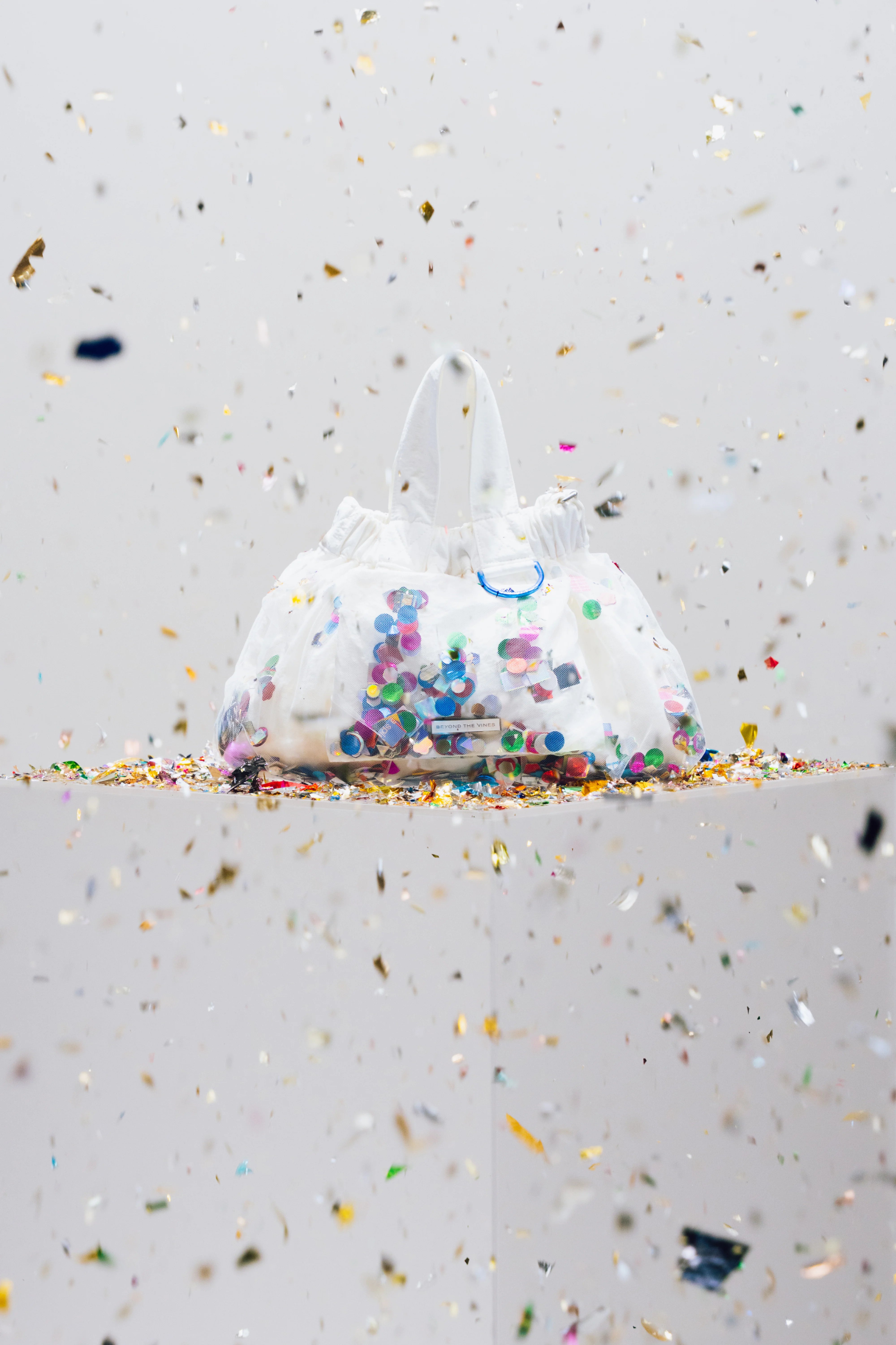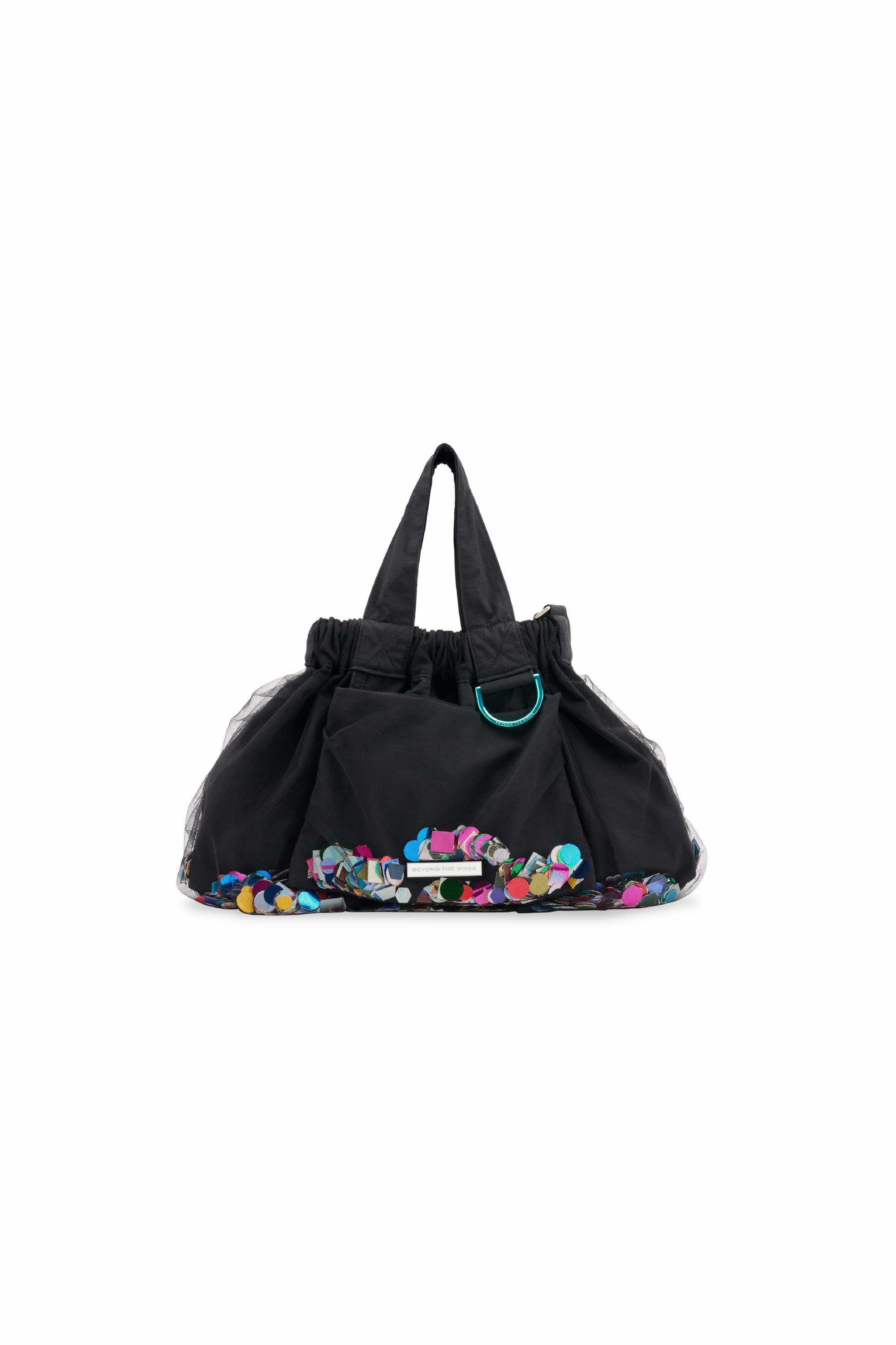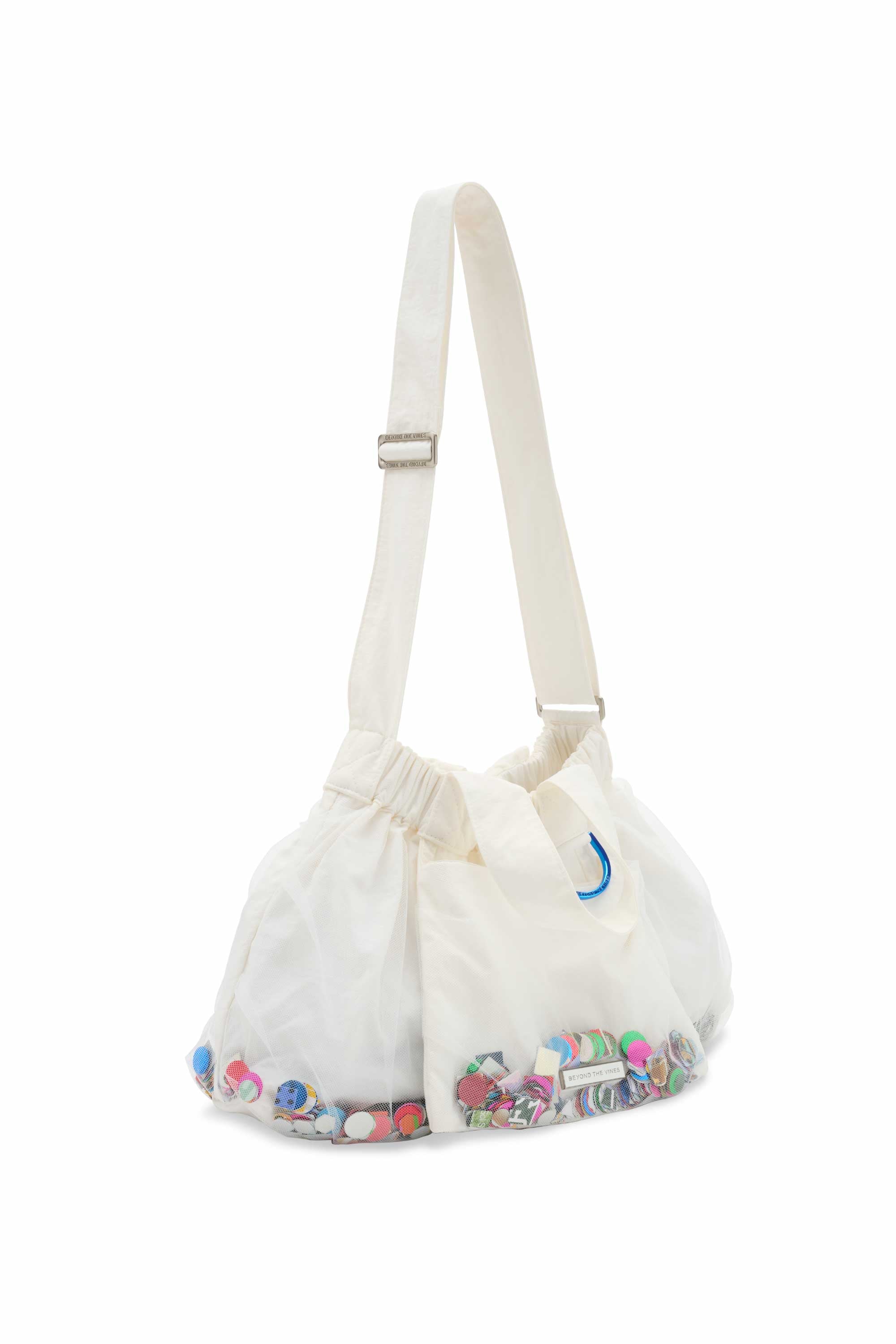 Introducing the Limited Edition Confetti Dumpling Bag, created in celebration of Beyond The Vines’ 10th anniversary. This special design layers soft mesh over durable nylon, with a playful mix of confetti - a blend of curated colours, materials, and archival Beyond The Vines posters, making each bag one of a kind. Finished with a coloured chrome D-ring, a magnetic closure, and an additional inner pocket, this statement piece is both functional and collectible.