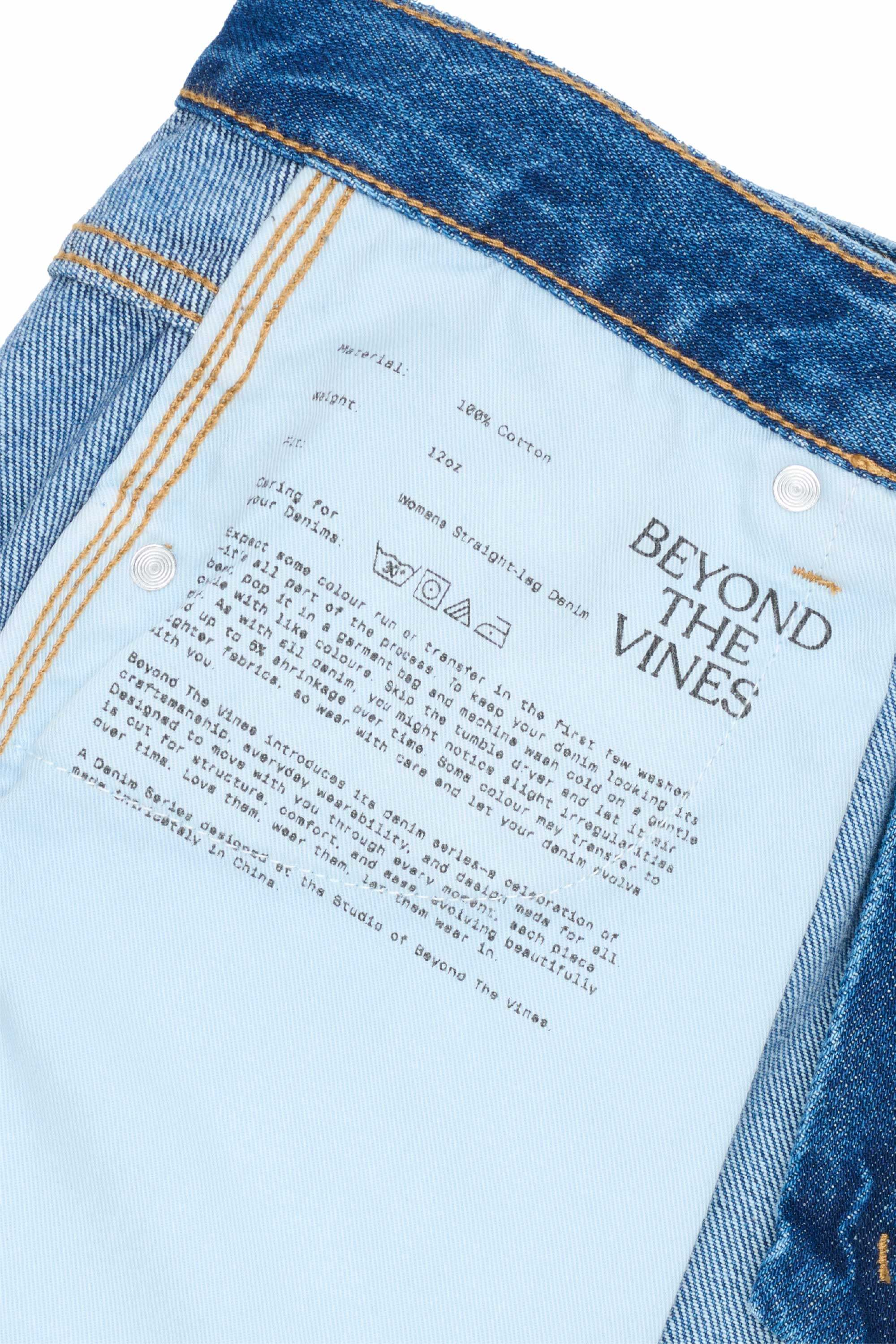Expect some colour transfer in the first few washes. Wash cold in a garment bag on a gentle cycle with similar colours. Line dry only; do not tumble dry. Slight irregularities and up to 5% shrinkage are natural to denim. Colour may transfer to light fabrics—wear with care as your denim evolves over time.