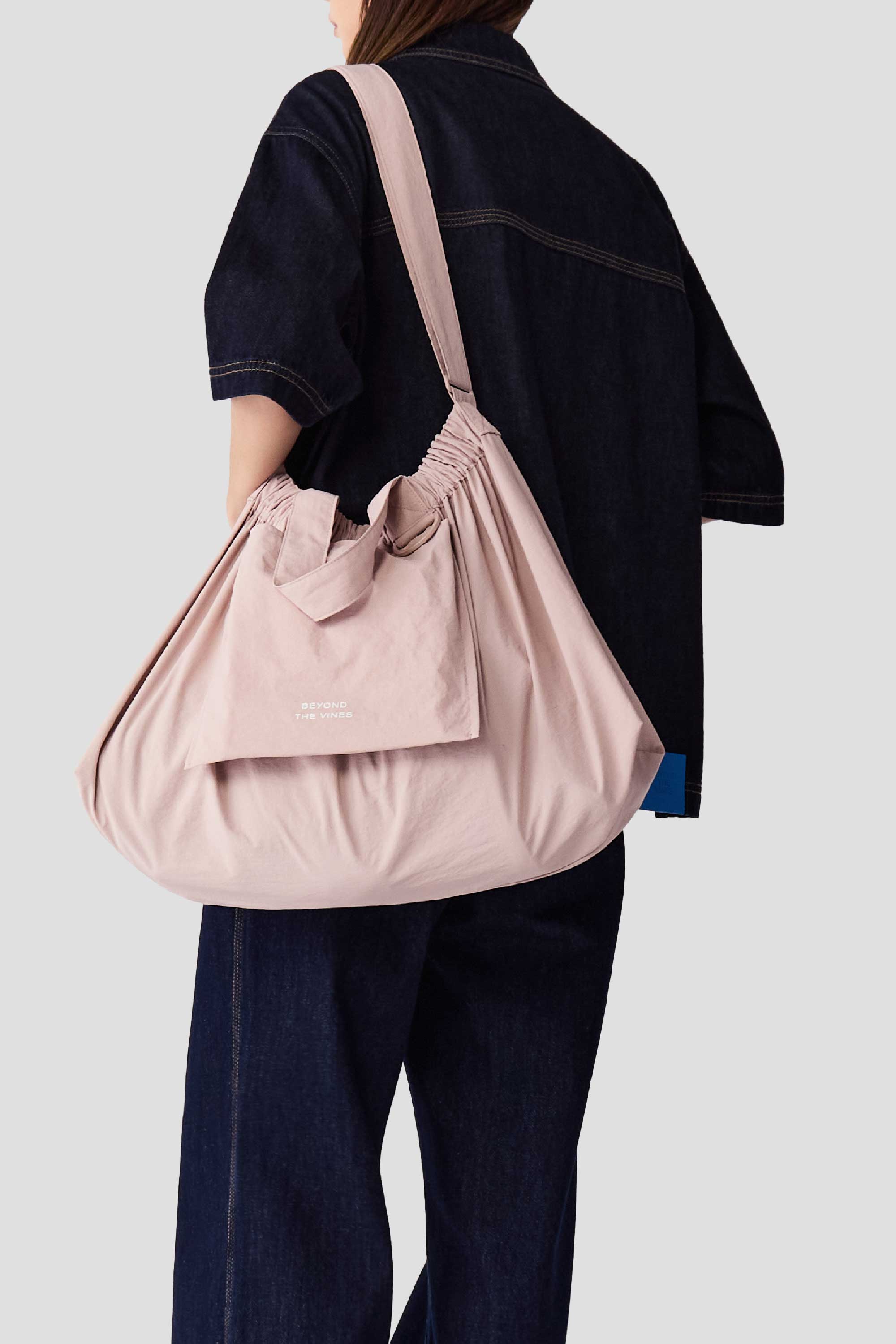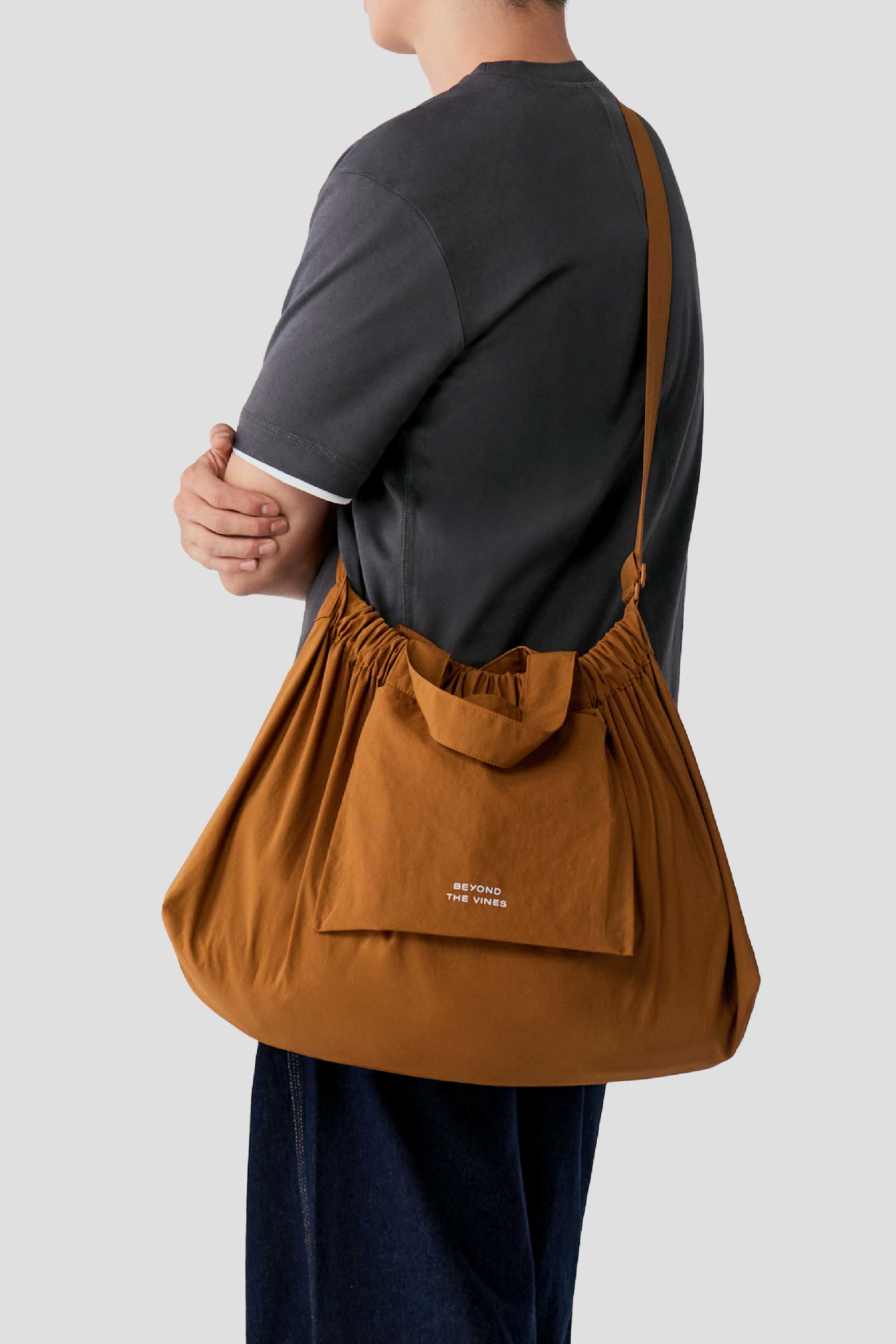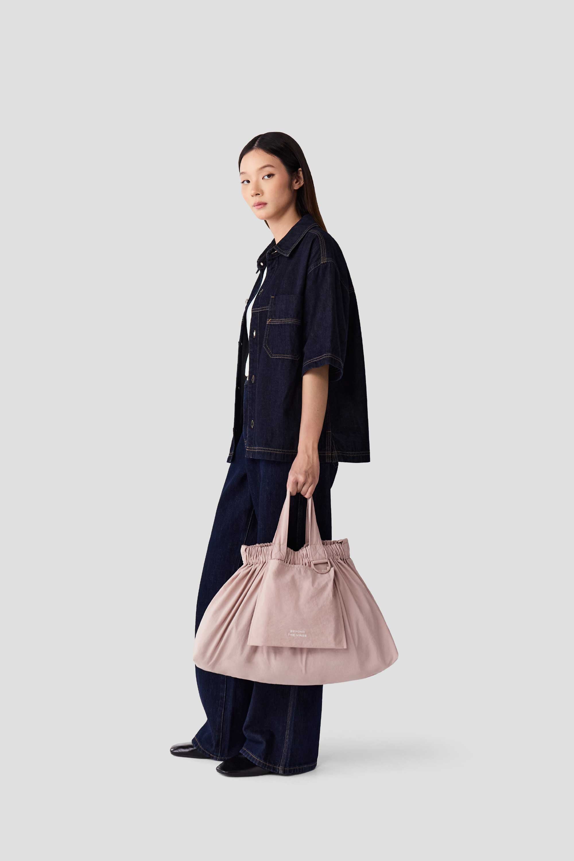 The largest size of the Dumpling Bag series, this packable bag is designed with short handles and an adjustable crossbody strap. It features a large front flap pocket, a D-ring to attach your keys to and an elasticated opening with a hidden magnetic closure. It is finished with our customised adjustable hardware.
