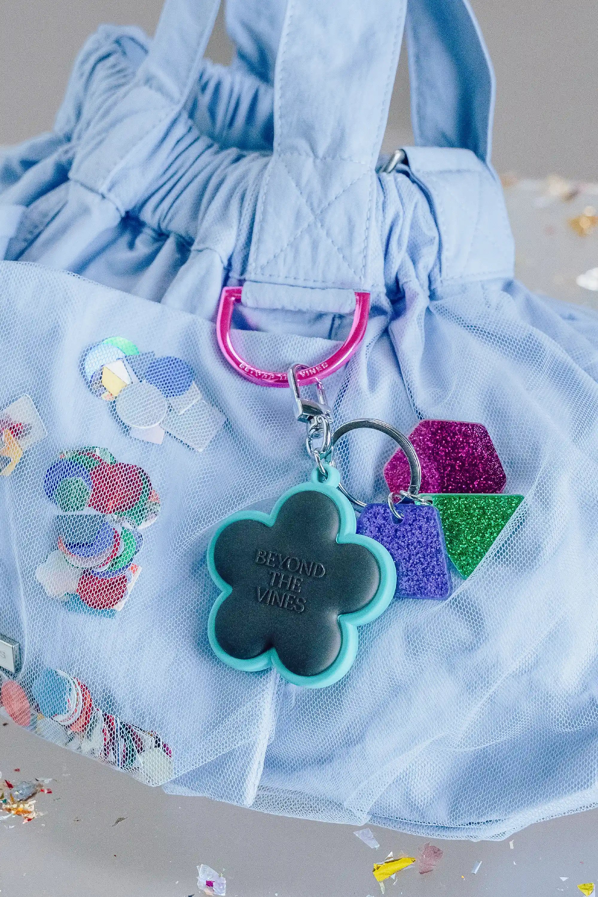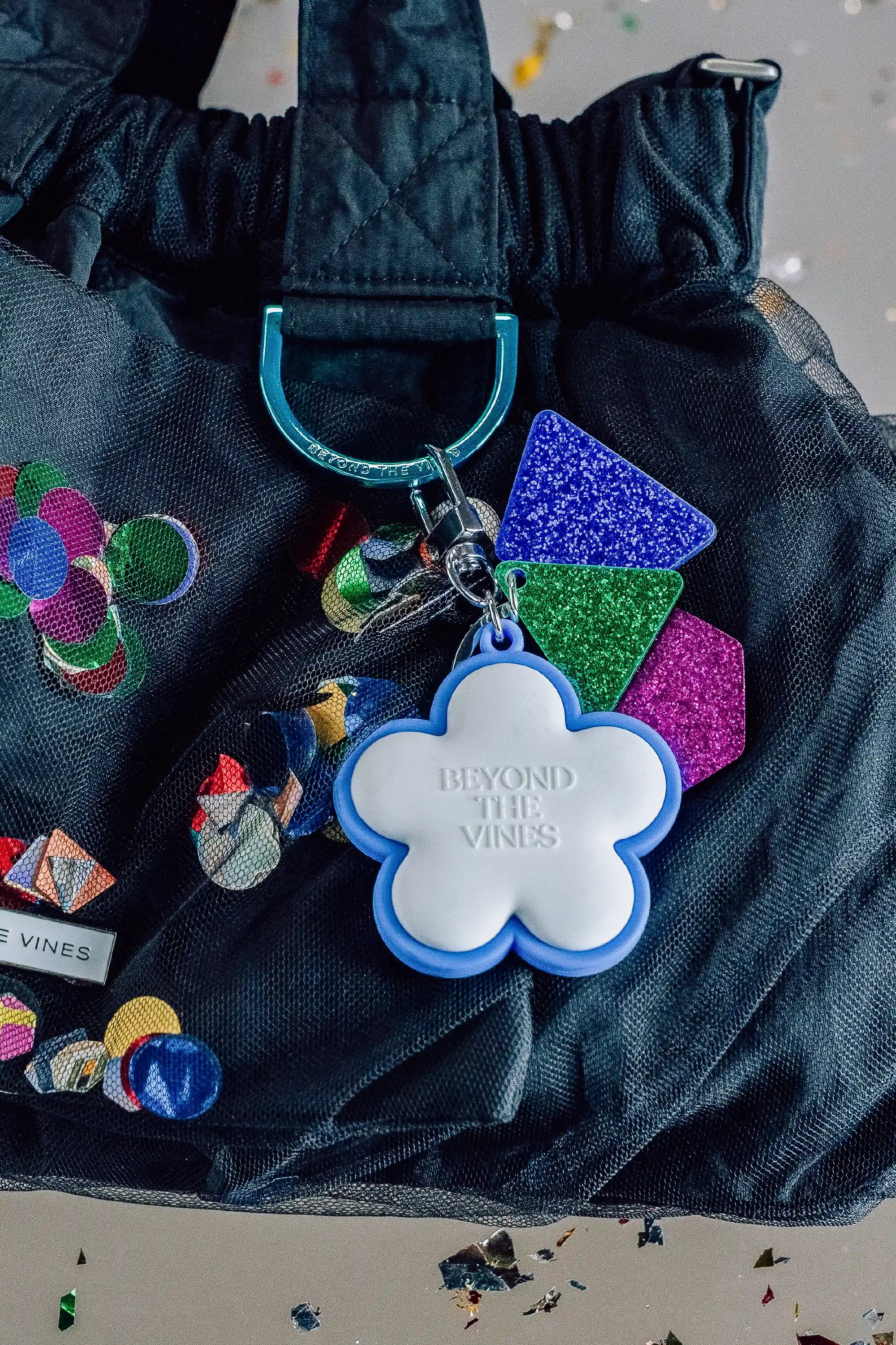 Designed to be detachable with two types of hardware, this petal-shaped pocket mirror features the Beyond The Vines logo on the front and a mirror on the back. Finished with geometric acrylic charms, it adds a fresh pop of colour to your everyday items. Use it with your keys or hang it onto your bag as a playful accent. Each pocket mirror comes in an acrylic round-shaped case.